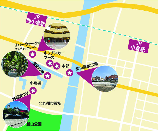 | 予定会場 | 10月11日(土) ①リバーウォーク北九州 ミスティックコート ②お城まつりステージ ③歴史の杜ステージ 10月12日(日) ①紫川親水広場 ②リバーウォーク北九州 ミスティックコート ③お城まつりステージ ④歴史の杜ステージ 予定は予告なく変更になる場合があります |
